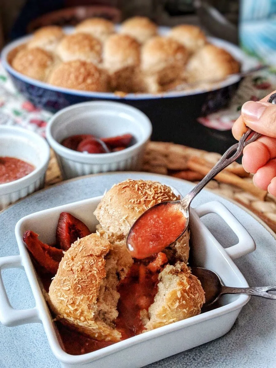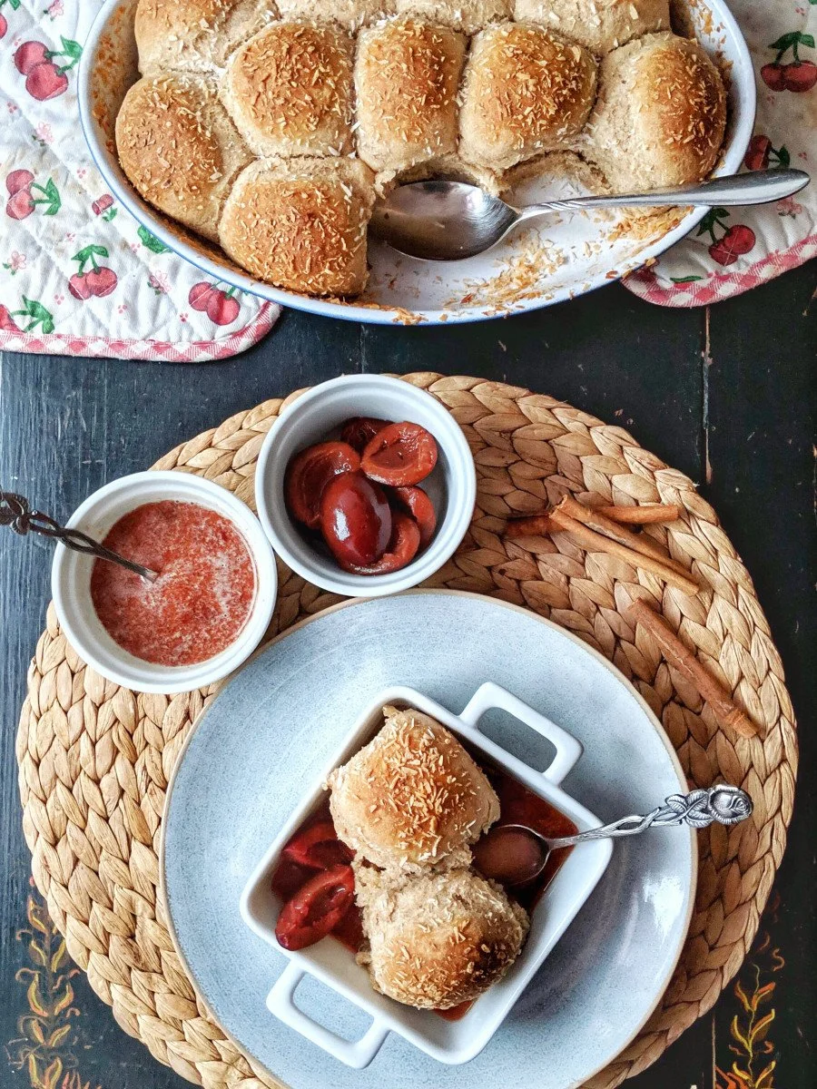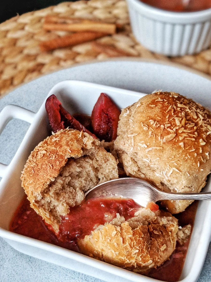 Am liebsten dippe ich meine Buchteln in eine fruchtige Sauce. Heute gibt es pürierte Zimt-Pflaumen dazu. Mein Mirabellen-Chia-Kompott würde aber auch toll dazu passen. Oder wie wäre es mit einer cremigen, selbstgemachten Vanillesauce?