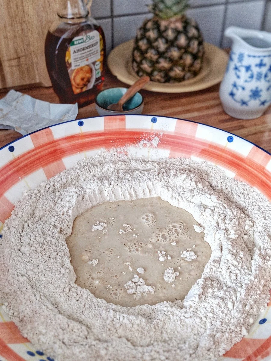 Ganz einfach! Du ersetzt die Hälfte des Mehls mit Vollkornmehl, ersetzt den Zucker durch Ahornsirup (oder Kokosblütenzucker) & die Sahne durch Pflanzenmilch. Ich habe hier Hafermilch genommen, aber Sojamilch funktioniert auch gut.