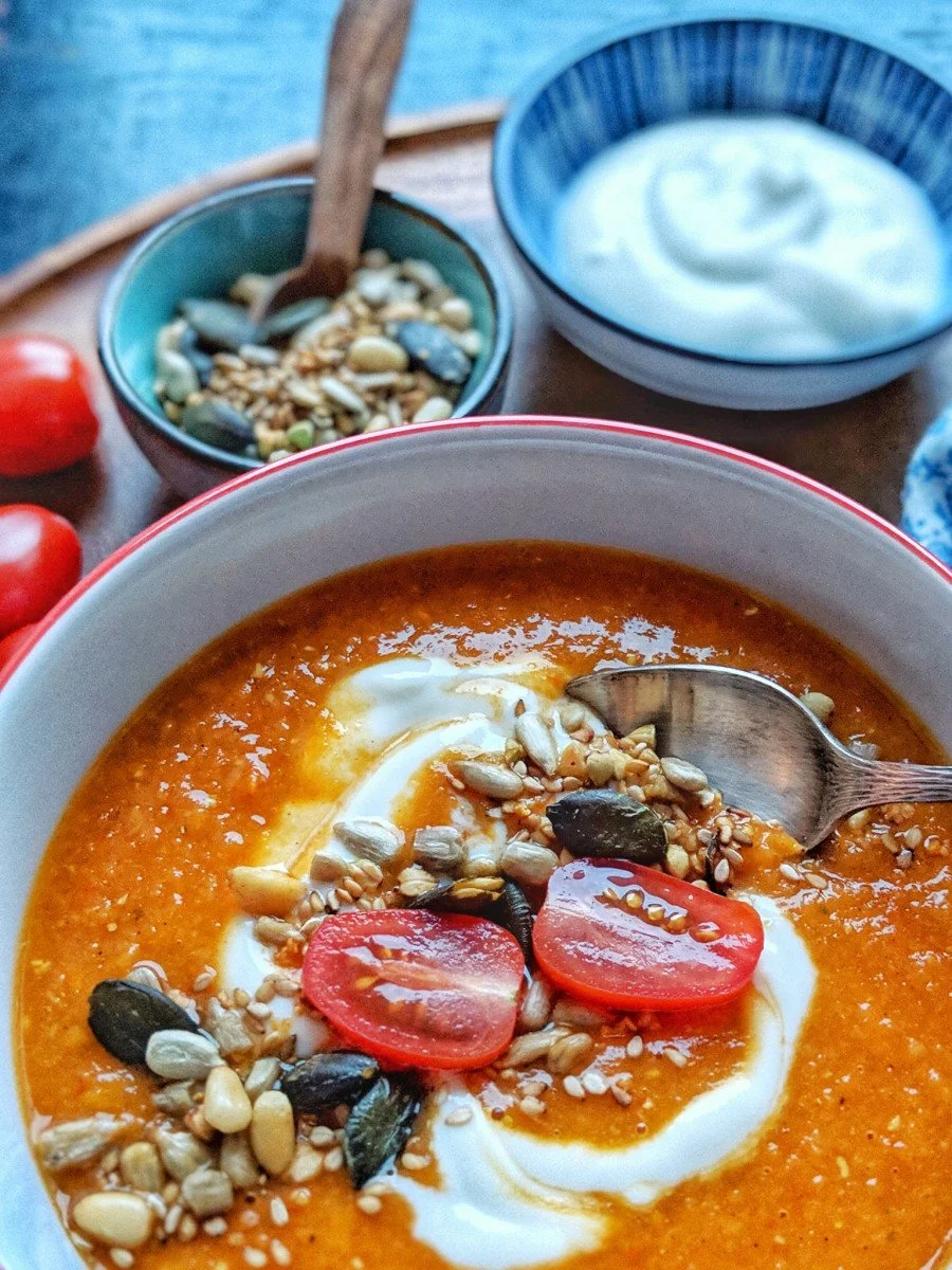 Linsen haben eine sehr hohe Nährstoffdichte und liefern außerdem wertvolles pflanzliches Eiweiß. Paprika & Tomaten bringen Vitamine und Mineralstoffe in die Suppe. Vor allem stecken sie voller Vitamin C und B-Vitamine sowie Kalium, Magnesium, Zink & Calcium. Und die Tomaten steuern obendrein noch Lycopin bei, dass durch das Erhitzen noch besser vom Körper aufgenommen werden kann. Lycopin ist ein sekundärer Pflanzenstoff mit antioxdativen Eigenschaften, der u.a. sehr gut für die Haut ist und ihre Widerstandskraft stärkt. Die Gewürze sorgen für ein orientalisches Aroma und regen ganz nebenbei auch noch die Verdauung an.