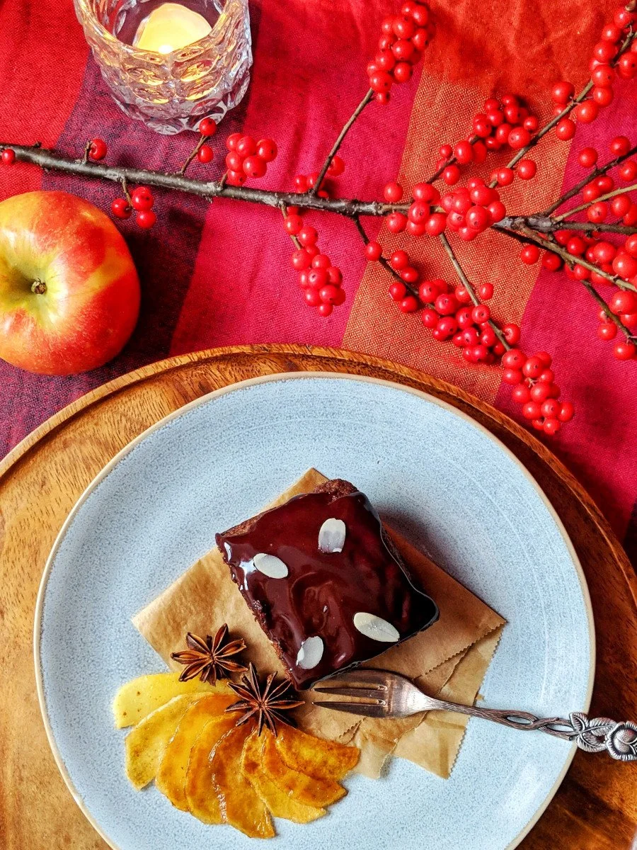 Apropos backen! Heute eröffnen wir hier auf meinem kleinen Blog die vorweihnachtliche Backstube und zaubern eine leckere Nascherei. Meiner Meinung nach den perfekten Kuchen für die Advents- & Weihnachtszeit! Nämlich fluffigsten Lebkuchenkuchen mit zartschmelzender Schokoladen-Ganache. Und als kleines Extraschmankerl gibt's karamellisierte Apfelscheiben dazu. 🍎