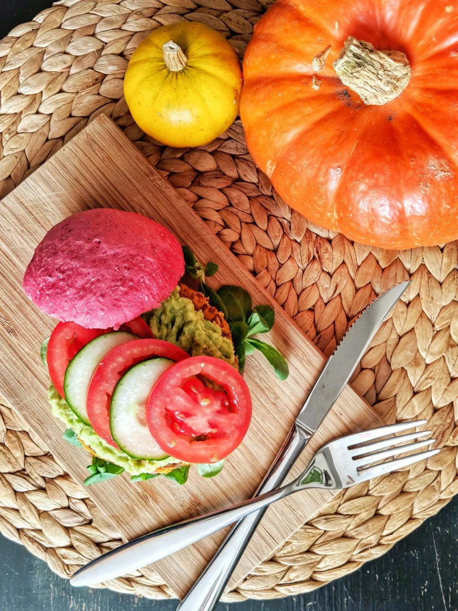 Aber was soll's. Knusprig saftige Veggie-Burger kann man ja eigentlich immer essen, stimmt's? Für mich ist das hier auf jeden Fall der perfekte Herbstburger. Nicht nur weil das Pattie mit Kürbis gemacht ist, sondern auch weil der ganze Burger so schön bunt ist. Ich habe das Kürbis-Pattie nämlich ganz kreativ mit meinen Rote-Bete-Burgerbrötchen kombiniert. Und die beiden sind wirklich ein Traumduo.