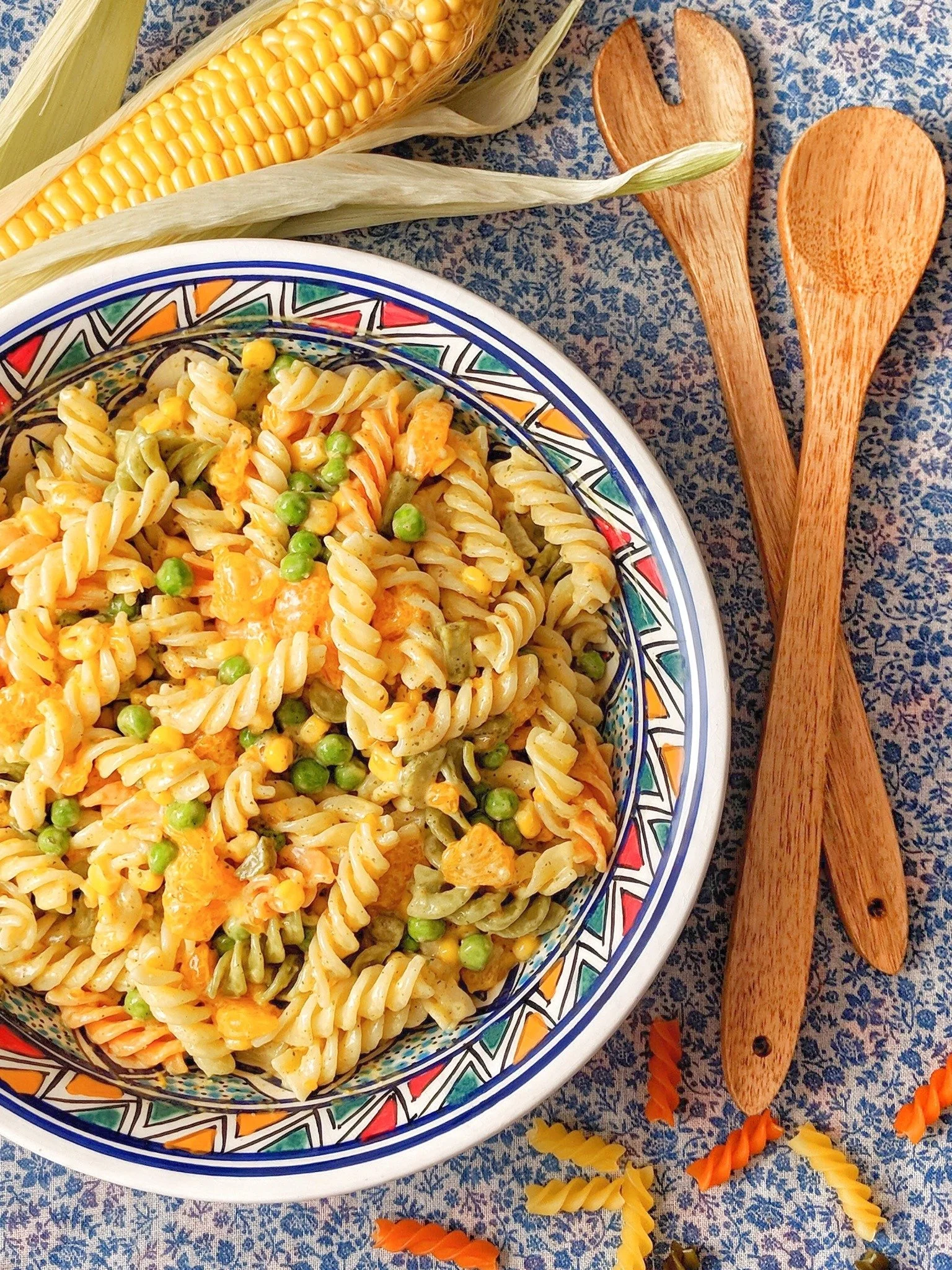 Sommerlich bunter Nudelsalat mit fruchtigen Mandarinen, frischen Erbsen & knackig-süßem Mais.