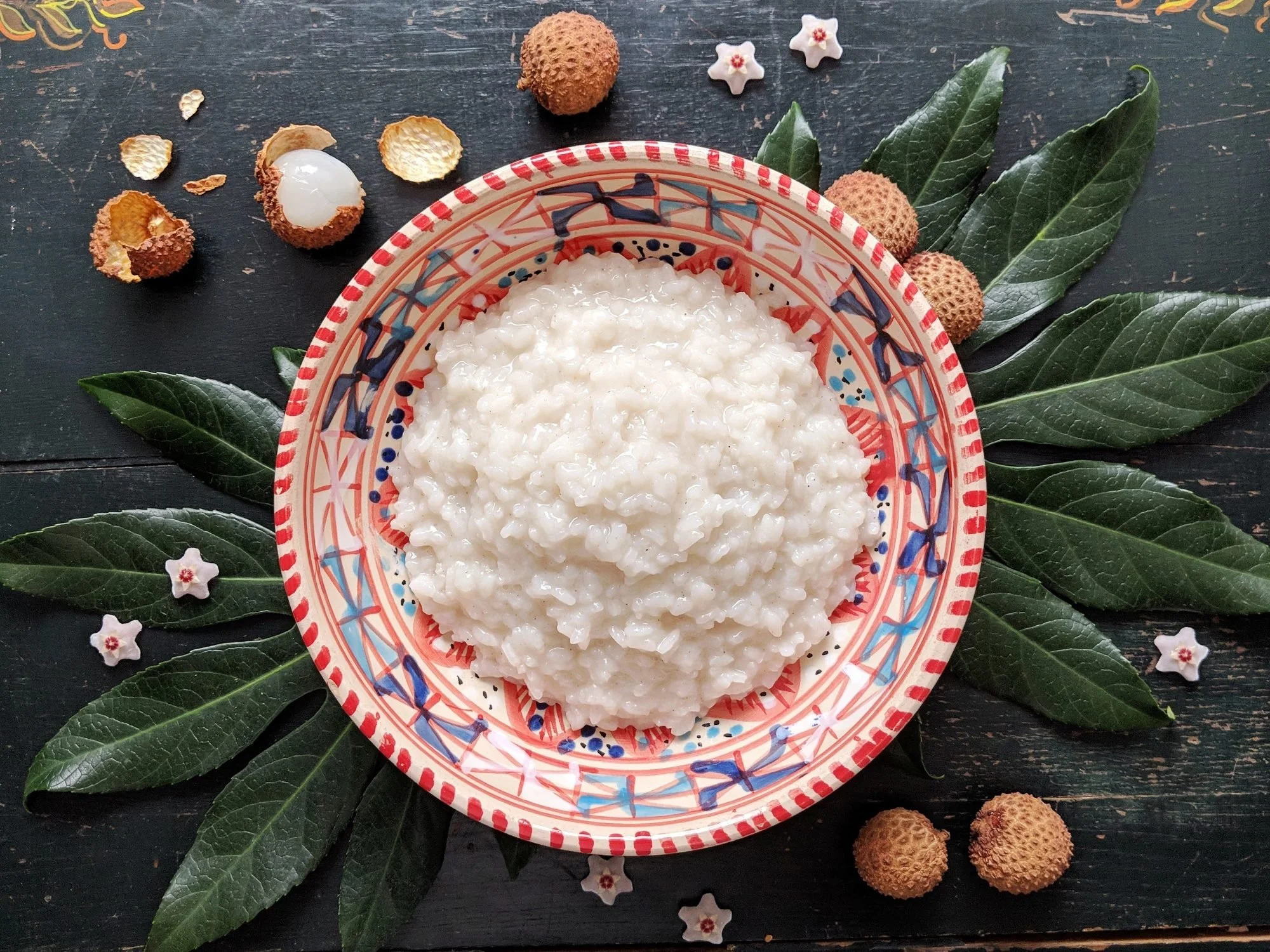 Ich habe außerdem noch eine Prise Kardamom in den Milchreis gerührt, weil ich ihm einen exotischen Touch geben wollte. Auf dem Markt gab es nämlich heute frische Litschis und da musste ich natürlich zugreifen. Hast du schon mal frische Litschis gegessen? Sie sind wunderbar süß und saftig und eignen sich nebenbei auch noch super als Milchreis-Deko 🙂