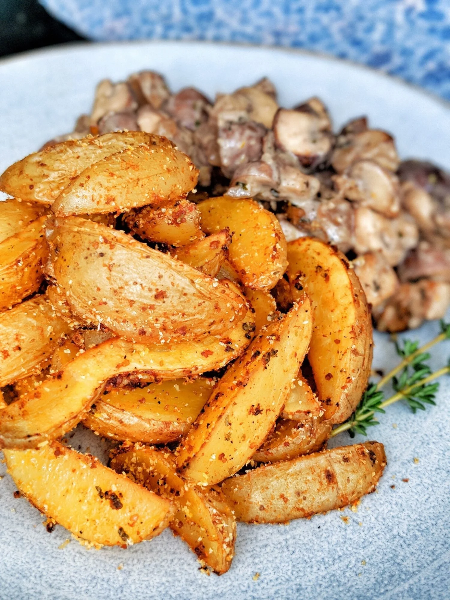 Ich habe mir heute cremige Knoblauch-Champignons dazu gemacht, du kannst die Wedges aber auch wunderbar einfach zu einem großen Salat essen. Am besten mit schön viel Dipp. Ganz klassisch mit Ketchup, oder probier doch mal meine leckere Mango-Ingwer-Salsa. Die ist ein erfrischend fruchtiger Kontrast zu den würzigen Wedges.