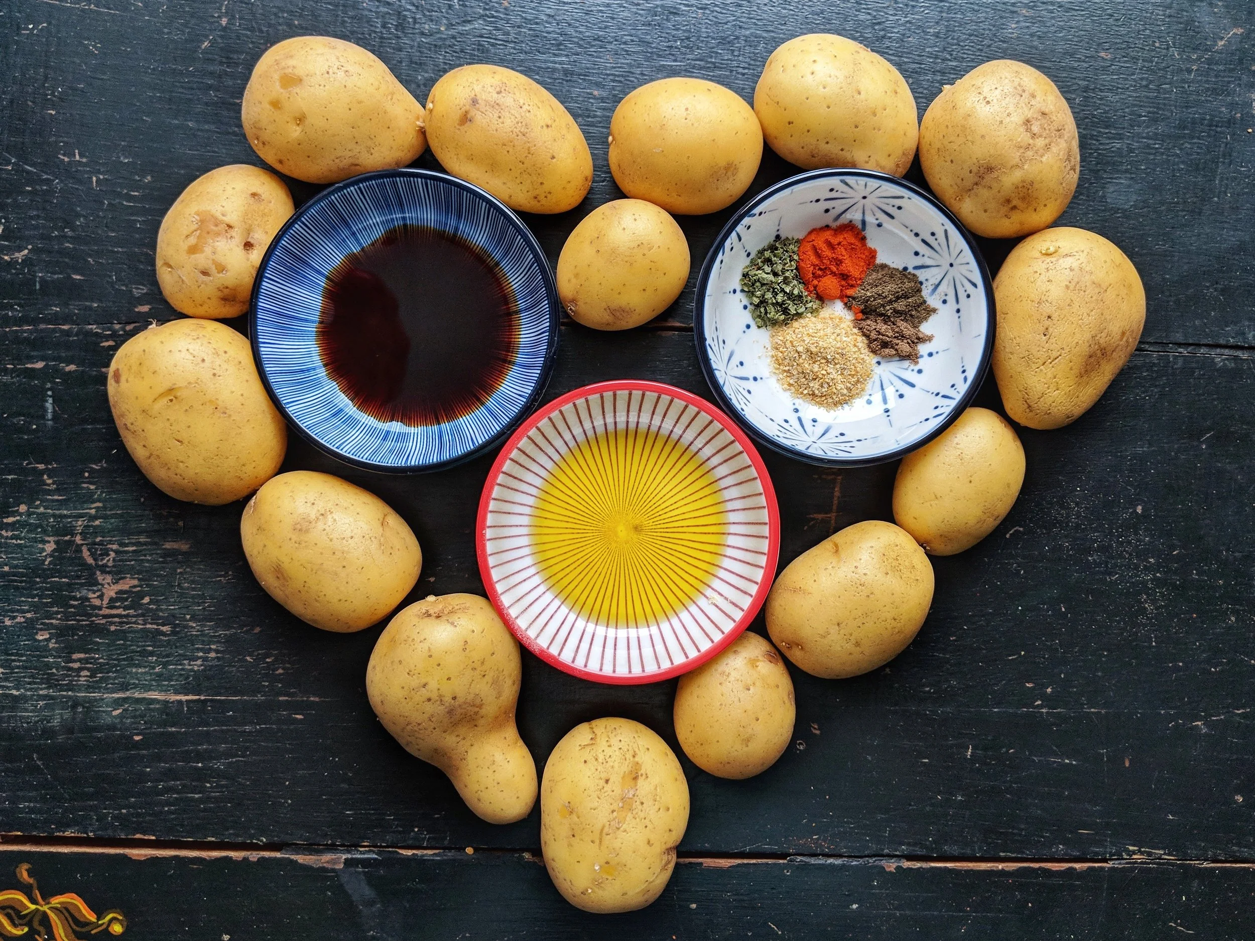 Das geht nämlich schneller & einfacher, als du vielleicht denkst. Alles was du brauchst, sind Kartoffeln (Ich habe relativ kleine, festkochende Kartoffeln mit nicht so dicker Schale genommen. Das erspart dir das Schälen. 🙂), Sojasauce, Olivenöl & ein paar Gewürze. Schnippeln, würzen, backen & schon fertig!