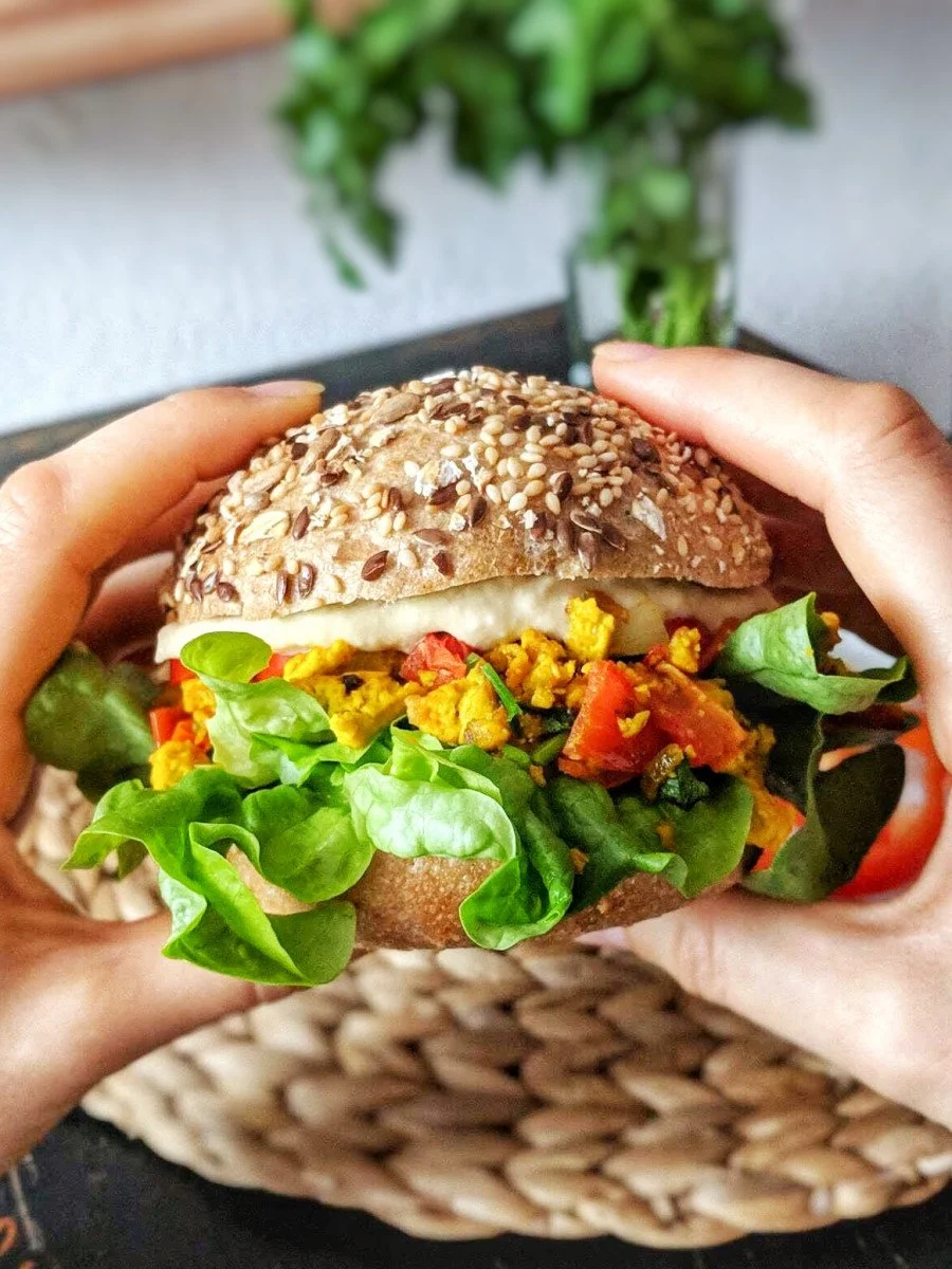 Für das Sandwich schneidest du einfach das Brötchen auf, bestreichst es mit Hummus und belegst es mit Salat und Paprika. Zum krönenden Abschluss verteilst du großzügig den heißen Rührtofu auf der unteren Brötchenhälfte und klappst die Oberseite vorsichtig oben drauf. Voilà!