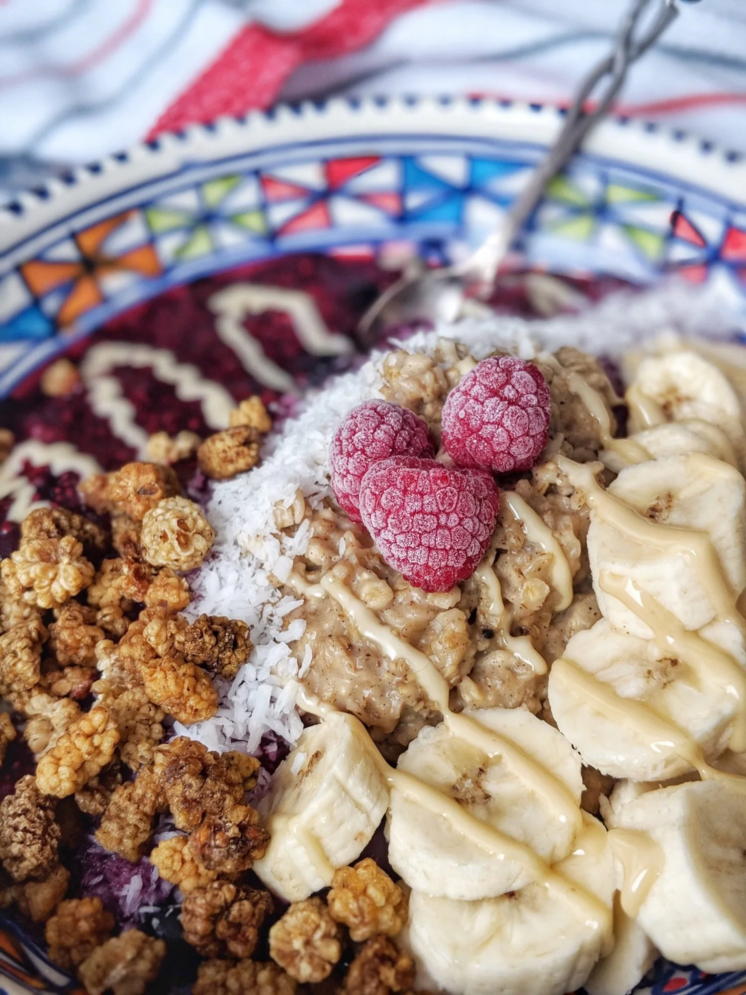 Dein Fertiges Porridge dekorierst du dann noch mit all den Dingen, die du am liebsten magst. Hier ein paar Topping-Inspirationen: Nüsse, Kokosraspeln, Rosinen, Maulbeeren, Nussmus, Samen & Kerne (am besten kurz angeröstet) oder eine Prise Zimt. Und die in Scheiben geschnittene Banane nicht vergessen. 🍌🙂