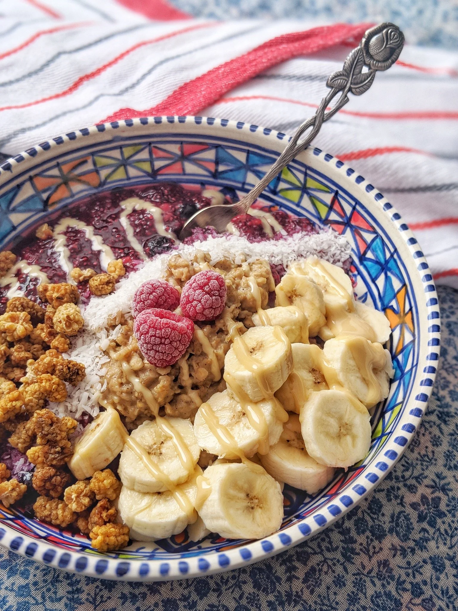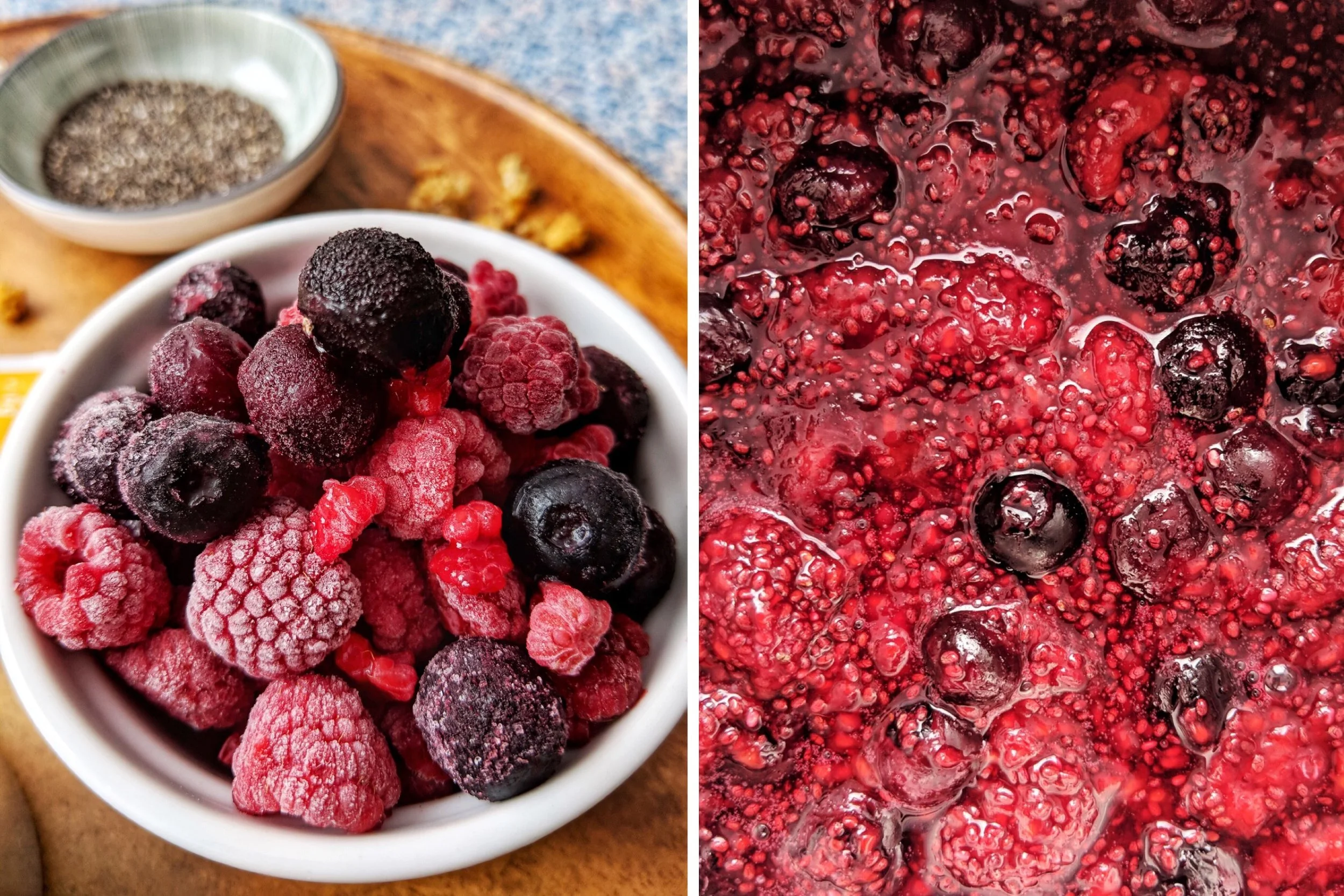 Mein heutiges Rezept ist natürlich vegan, ohne Zucker und statt Toast mit Marmelade gibt es fruchtiges Chia-Beeren-Kompott dazu. Ich habe gefrorene Himbeeren & Blaubeeren für das Kompott genommen, aber du kannst eigentlich nehmen, was die Tiefkühlabteilung hergibt: Erdbeeren, Kirschen, Waldfrüchte, Pflaumen oder sogar Mango.