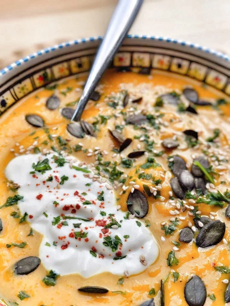 Diese Suppe kommt bei uns immer auf den Tisch, wenn ich etwas Warmes für die Seele brauche. 💫 Ich liebe einfach die Kombination von fruchtig und leichter Schärfe und sogar die Farbe verströmt Gemütlichkeit und Wärme.