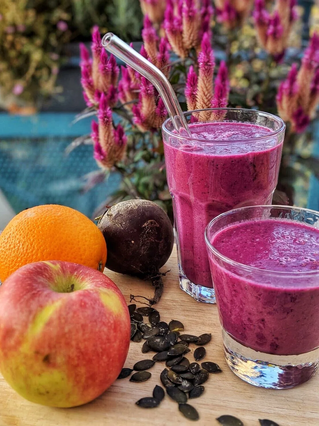 Dieser Smoothie sieht aber nicht nur super aus, er hat es auch in sich. Blumenkohl und Rote Beete versorgen dich mit mit vielen Mineralstoffen (u.a. Calcium, Magnesium, Zink, Eisen & Mangan). Blaubeeren liefern ganz viel Vitamin C & E. Bananen enthalten Kalium, Magnesium & Vitamin B6. Hanfsamen & Chia sind vollgepackt mit wertvollen Omega 3 Fettsäuren. Und Kürbiskerne sättigen nicht nur, sondern bringen auch nochmal Eisen mit in den Smoothie (immer wichtig, aber vor allem bei einer rein pflanzlichen Ernährung).
