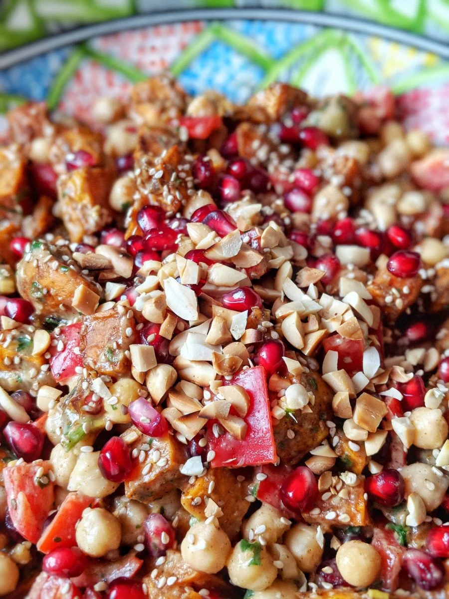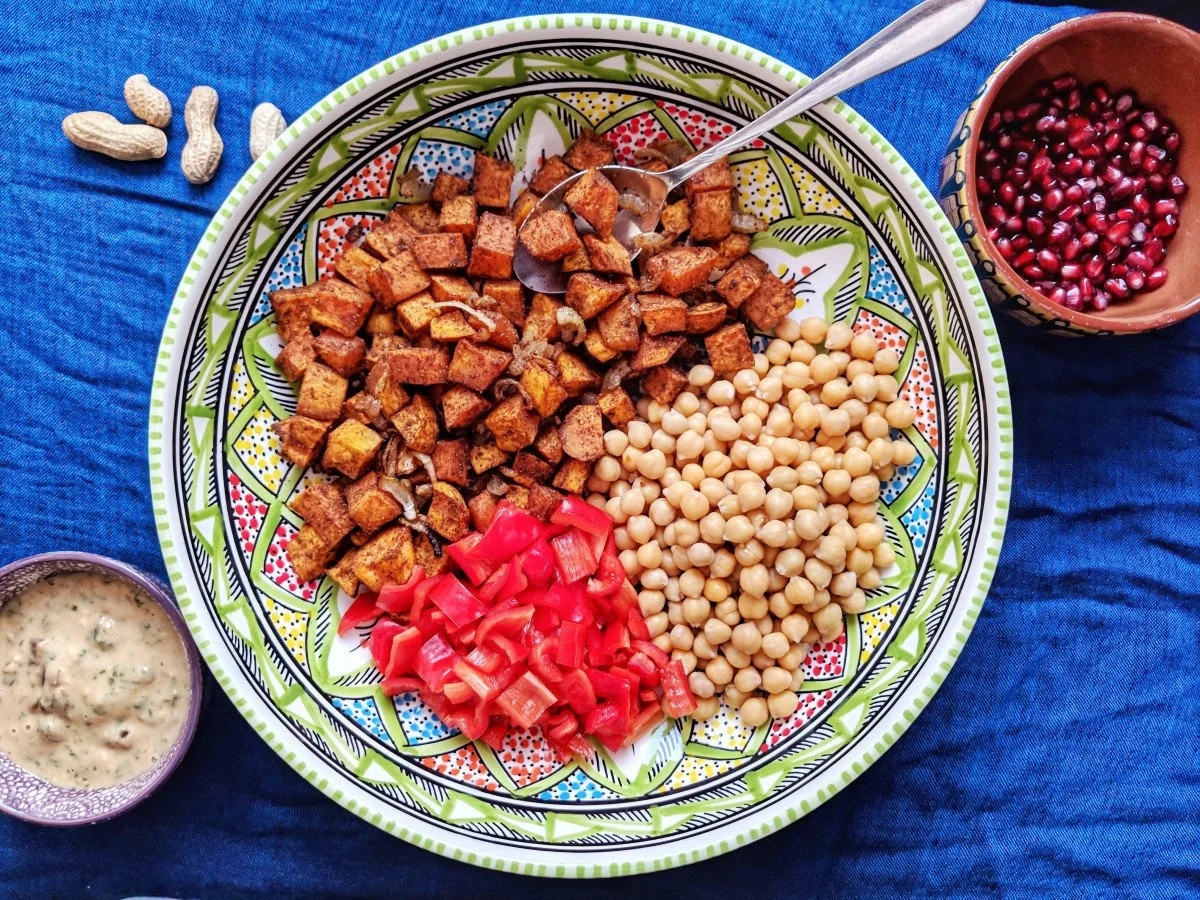 Süßkartoffel-Kichererbsen-Salat mit cremigem Erdnussdressing