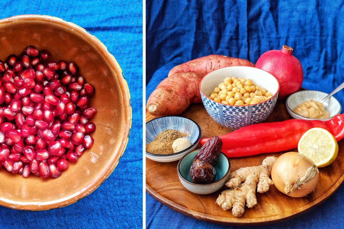 Aber zurück zum Salat. Der ist nämlich auch traumhaft und wirklich im Handumdrehen zubereitet. Während die Süßkartoffeln im Ofen schön weich backen, mixt du das Dressing zusammen und schnippelst frisches Gemüse. Am langwierigsten ist glaube ich die Granatapfelfummelei. Aber du kannst vieles für den Salat super schon am Vorabend (oder morgens) vorbereiten.