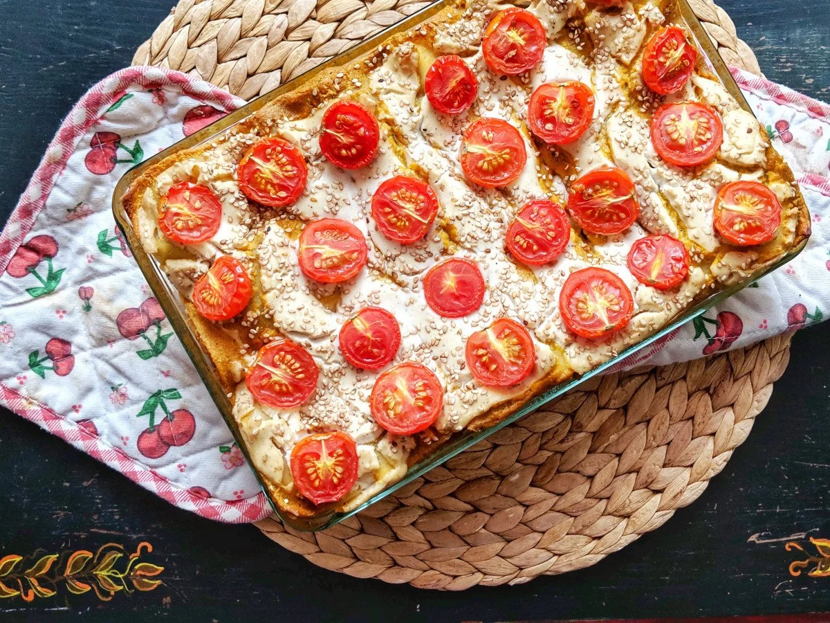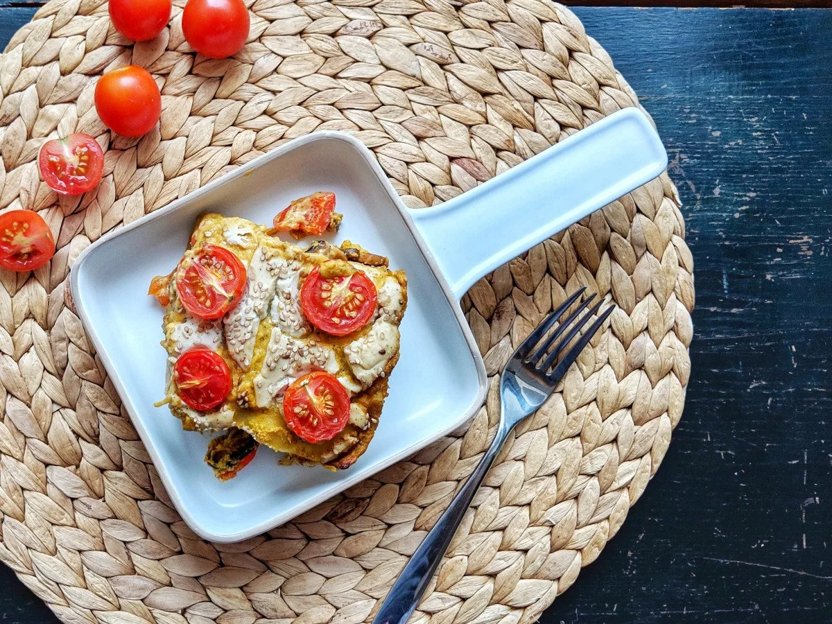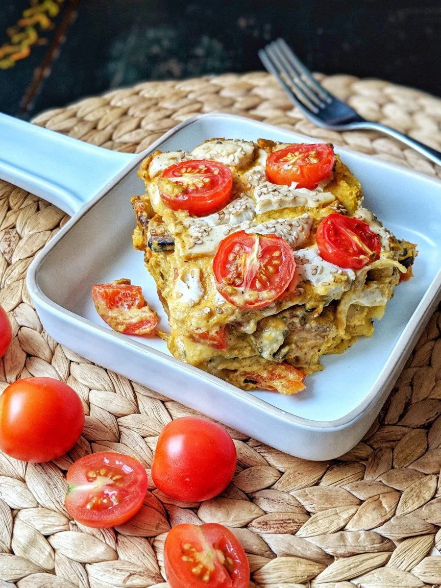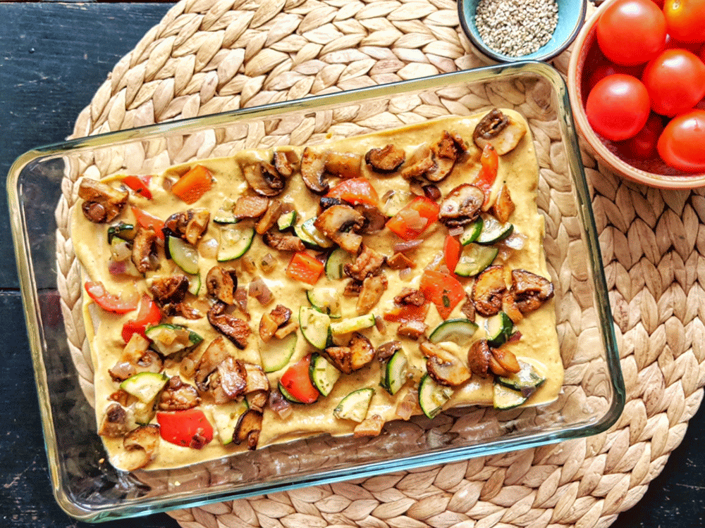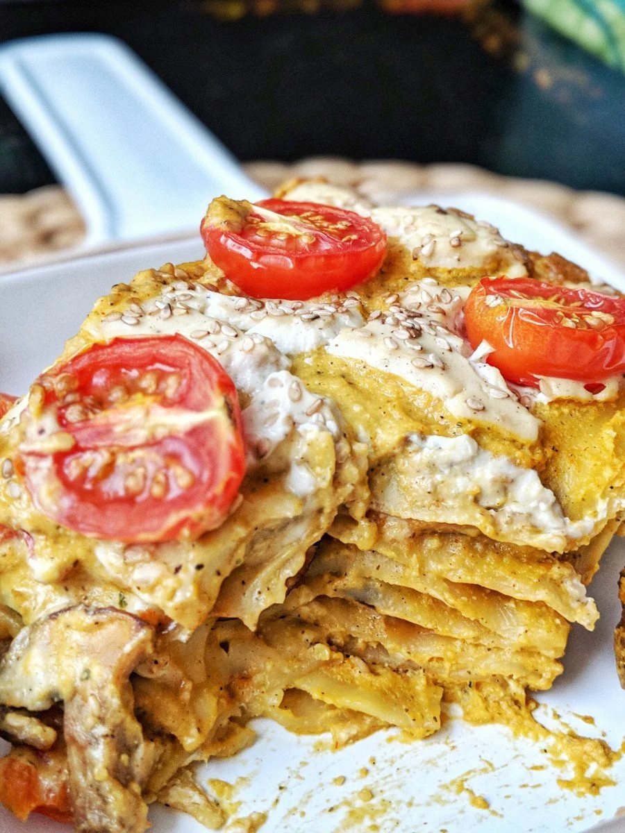 Ein Stück von dieser Lasagne hat alles, was du zum Glücklichsein brauchst: Leckere Nudelschichten, die in cremiger & leicht käsiger (Hefeflocken sei dank 😋) Sauce schwimmen. Und dazwischen herzhafte Pilze und knackiges Gemüse. Für noch mehr Cremigkeit sorgt eine frische Mandel-Joghurt-Creme und als krönender Abschluss finden sich ganz oben fruchtige Kirschtomaten ein. Hach, da bekomm ich beim Schreiben direkt schon Appetit. 🤤