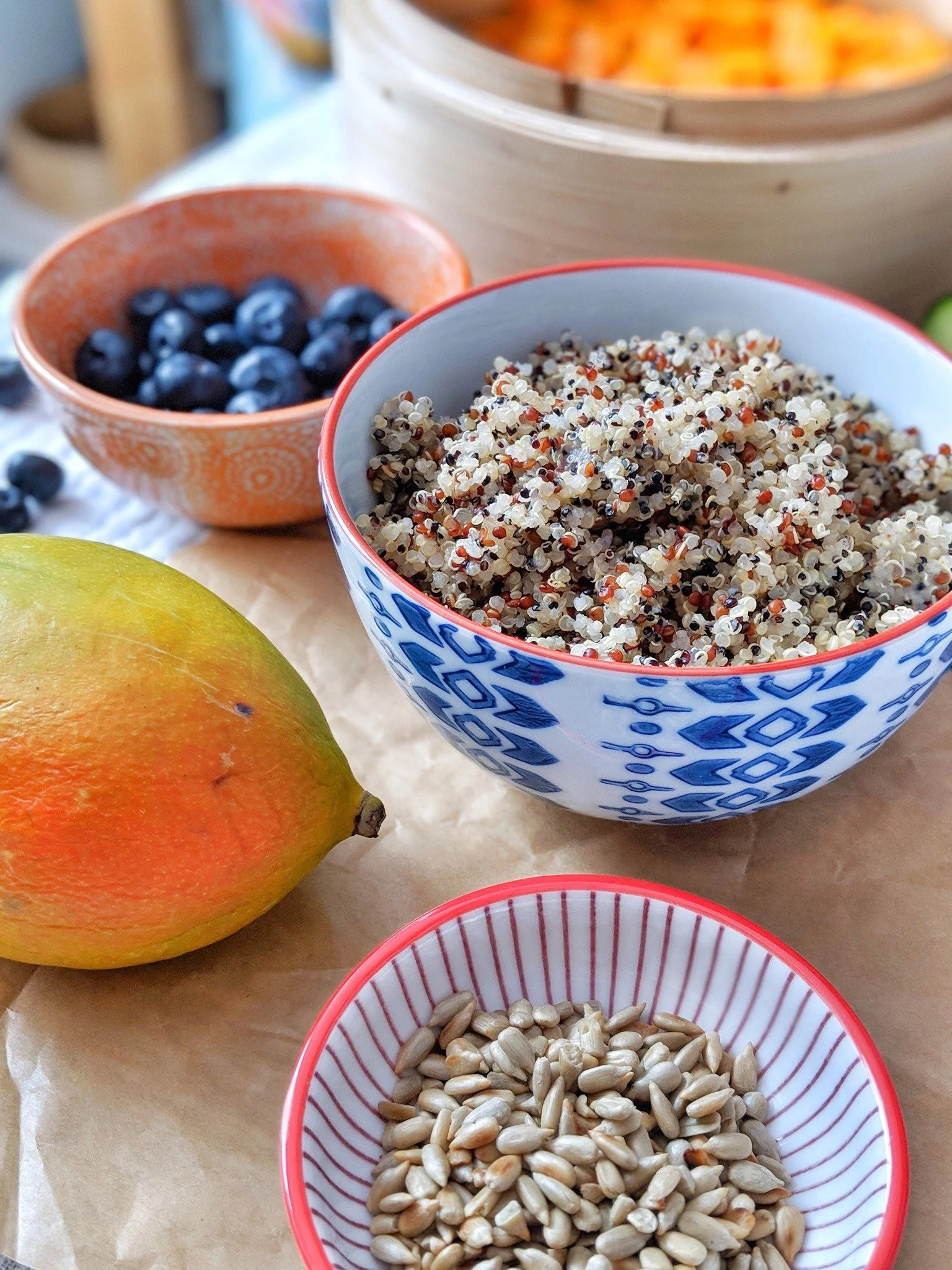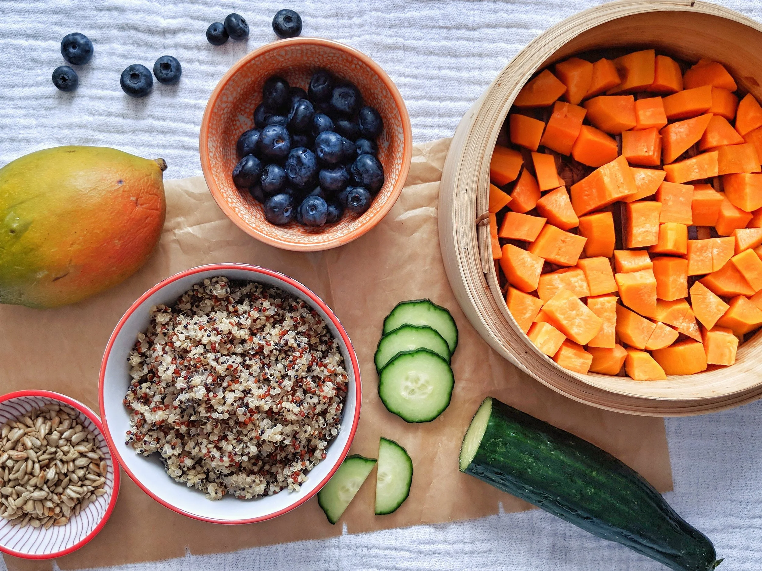 Heute gibt es Süßkartoffel-Quinoa-Mango-Salat.