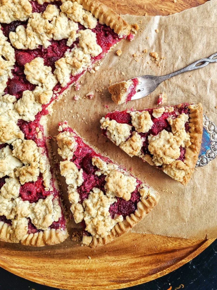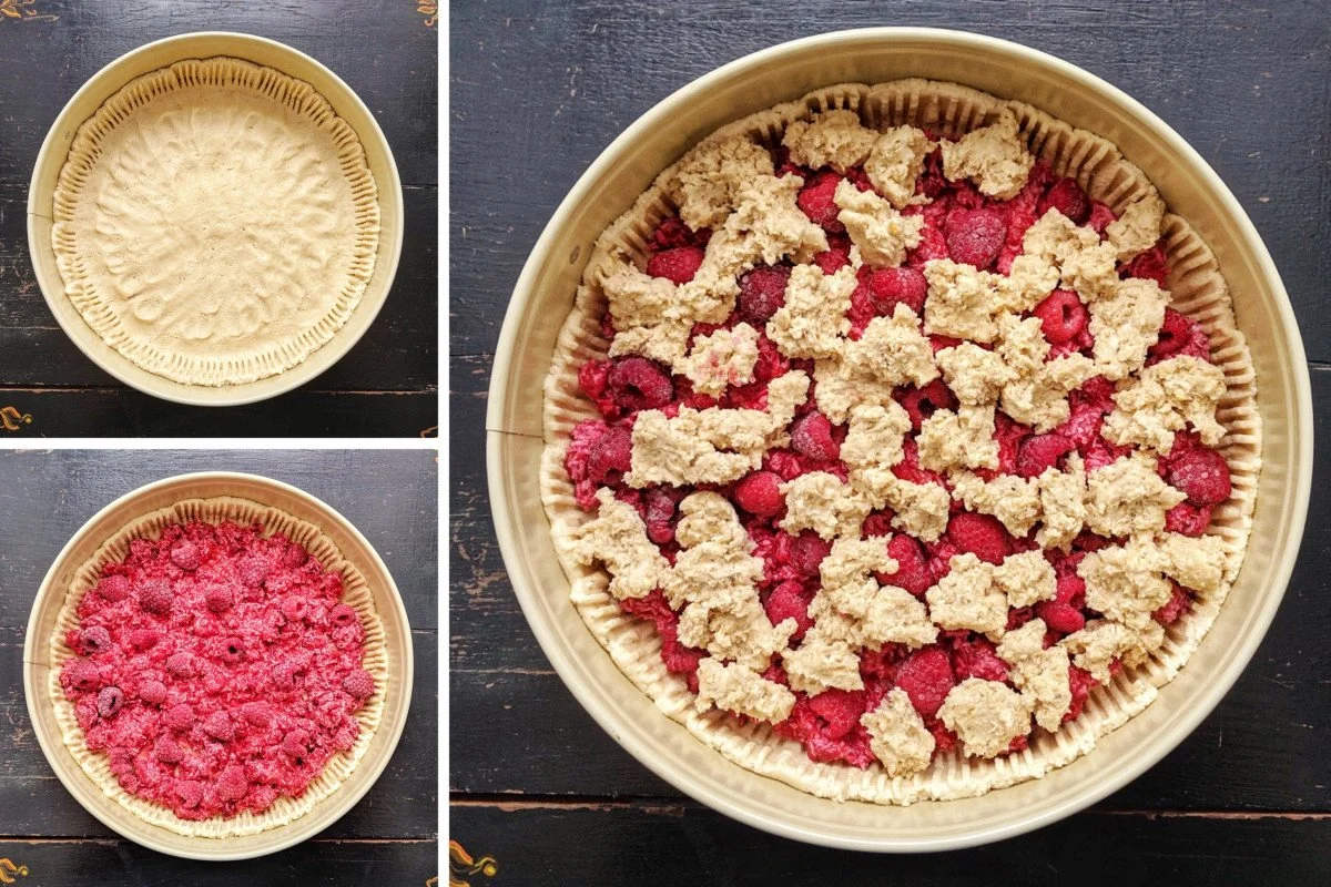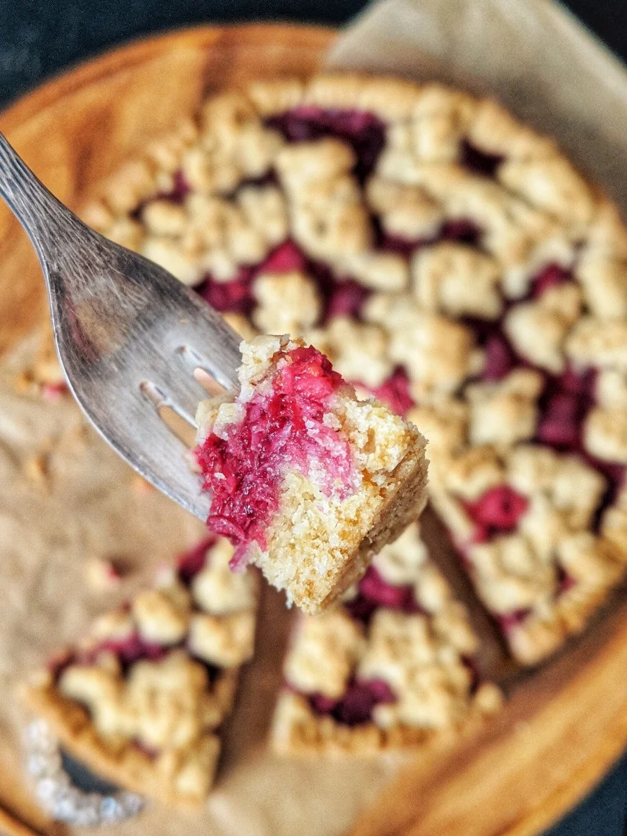 So machst du veganen Himbeer-Streuselkuchen