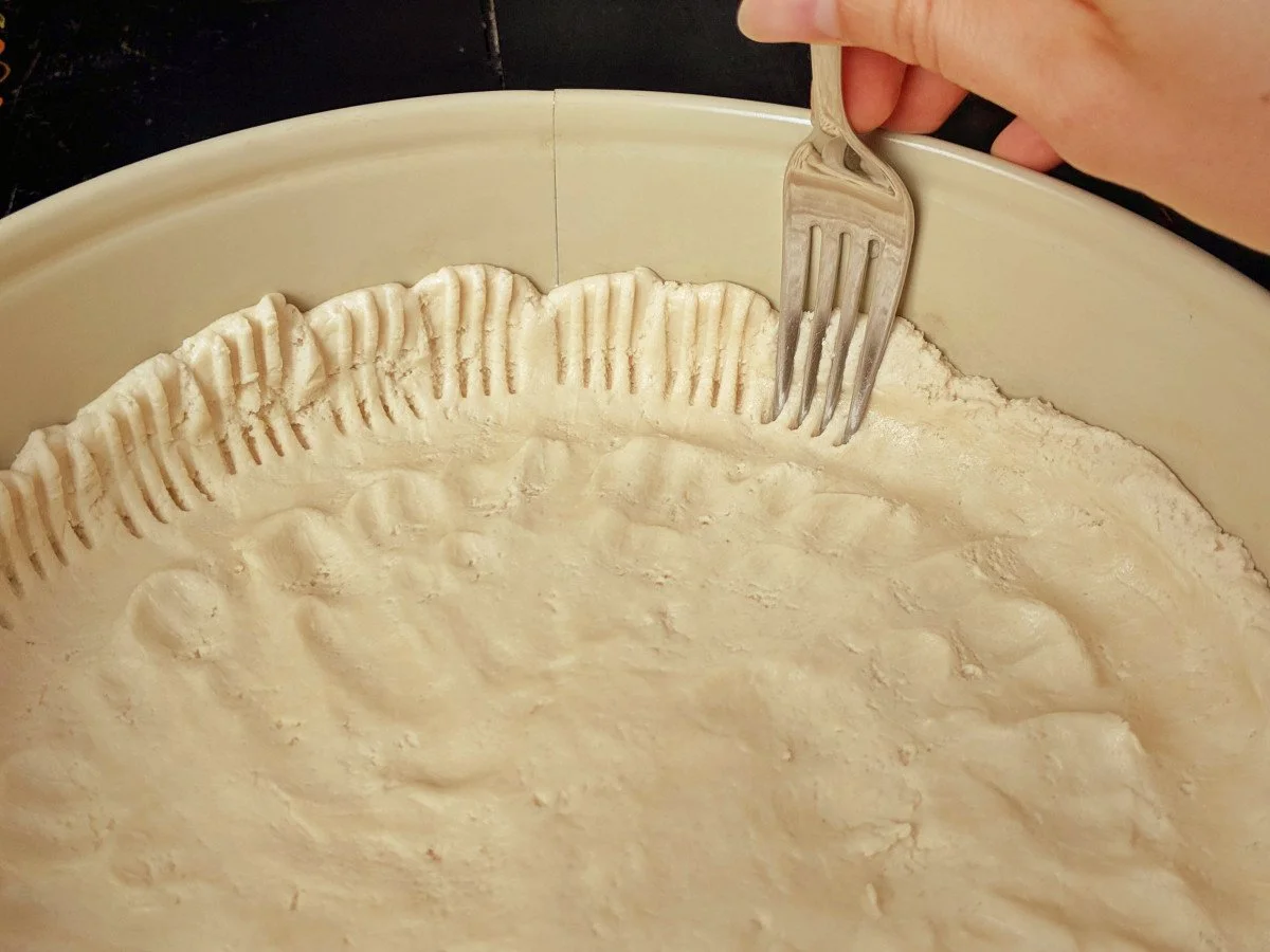 Gib den Teig in die vorbereitete Backform und drücke ihn mit den Fingern flach. Lass außen einen kleinen Rand hochstehen. Diesen kannst du dann mit den Zinken einer Gabel nach oben drücken (siehe Foto).
