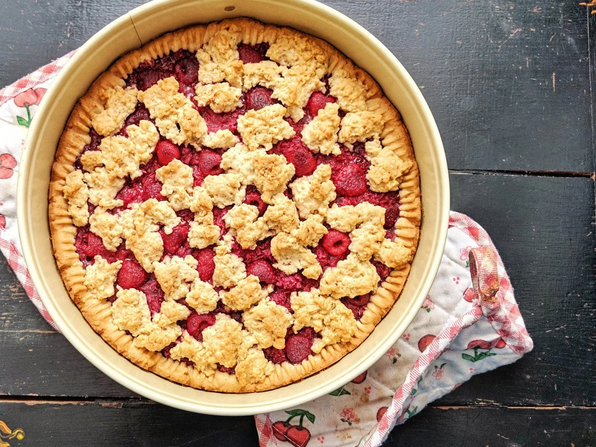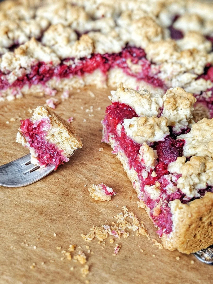Knusprig fruchtiger Streuselkuchen mit Himbeeren.